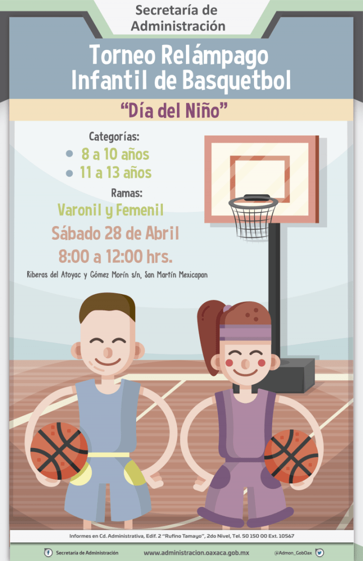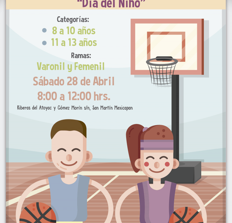 El sábado 28 de abril a partir de las 8:00 de la mañana se realizará el Torneo Relámpago Infantil de Basquetbol en la Unidad Recreativa “Río Atoyac” en las categorías de 8 a 10 años y de 11 a 13 años de edad en las ramas femenil y varonil.