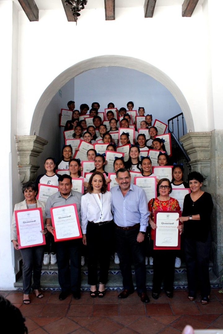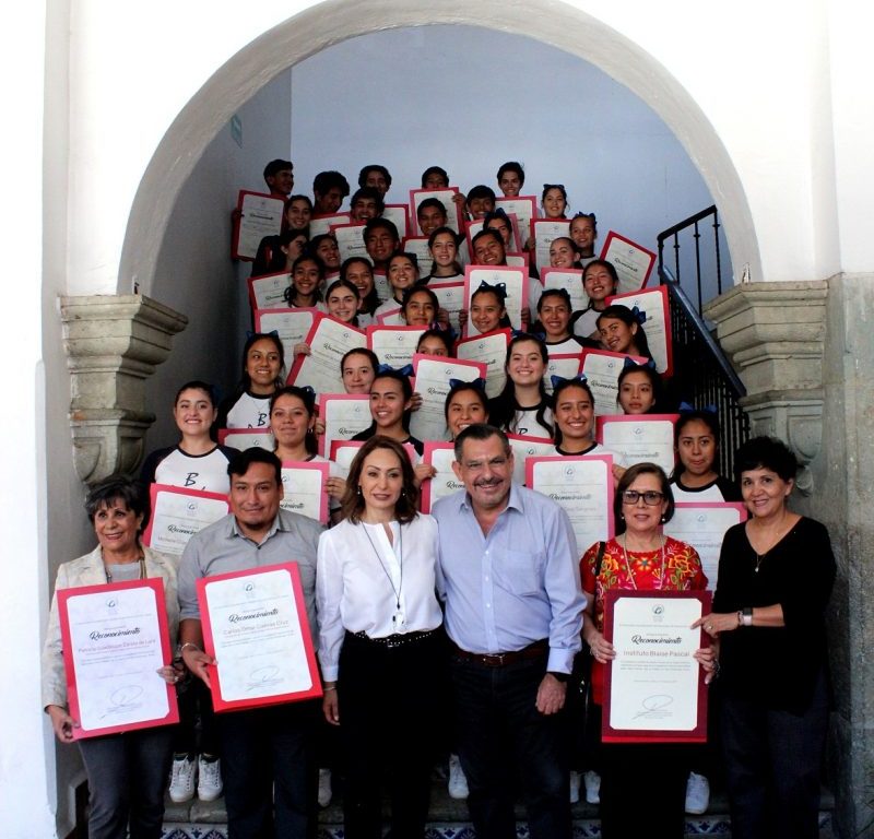Oaxaca de Juárez, Oaxaca, 13 de mayo de 2018.- El Presidente Municipal, José Antonio Hernández Fraguas, y su esposa la Presidenta Honoraria del DIF Municipal, Lorena Córdova Brena, entregaron reconocimientos a integrantes y profesores del Grupo Folclórico del Instituto Blaise Pascal (IBP), por su actuación en la competencia internacional de baile “Baltic Pearl Festival”, celebrado en San Petesburgo, Rusia del 1 al 4 de mayo.