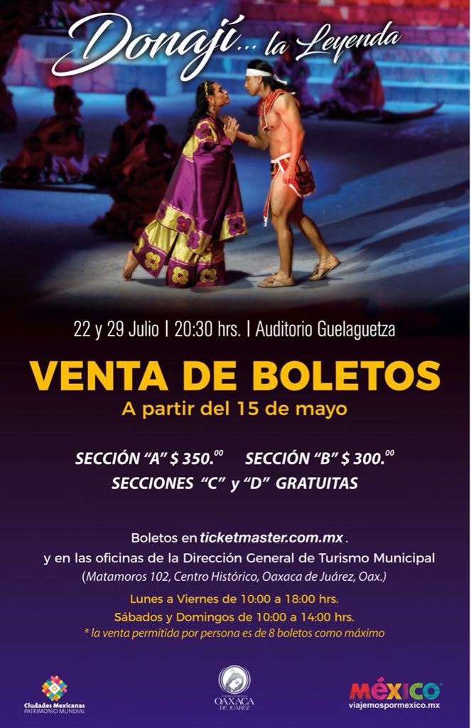 Oaxaca de Juárez, Oaxaca, 15 de mayo de 2018.- La Dirección de Turismo del Municipio Capitalino invita a las y los oaxaqueños, así como a turistas nacionales e internacionales, a adquirir los boletos para las dos presentación de “Donají…La Leyenda 2018”, que se llevarán a cabo los días 22 y 29 de julio a las 20:30 horas, en el Auditorio Guelaguetza.