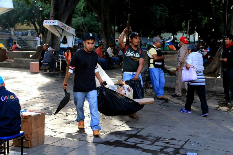 Oaxaca de Juárez, Oaxaca, 20 de junio de 2018.- Tras el retiro paulatino del plantón magisterial del zócalo y Alameda de León, la Dirección del Sistema de Limpia del Municipio Capitalino realiza la recolección de basura y barrido de calles aledañas.
