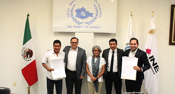 A propuesta de la Junta Local Ejecutiva del Instituto Nacional Electoral (INE) y de la Defensoría de los Derechos Humanos del Pueblo de Oaxaca, candidatos de todos los partidos políticos suscribieron una agenda de derechos humanos para incluir este tema en sus plataformas electorales este viernes 22 de junio en la sede del organismo defensor.
