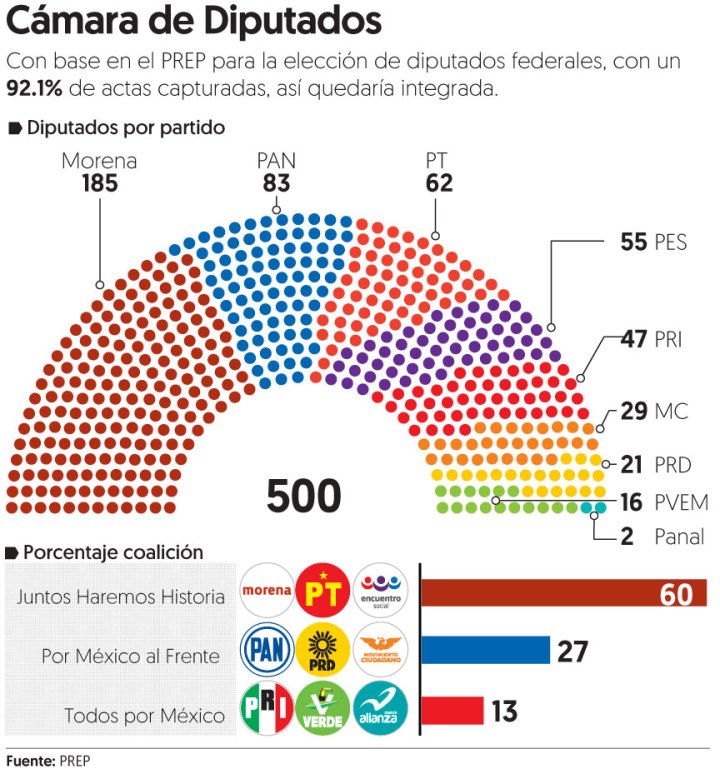 En la Cámara de Diputados, como primera fuerza mayoritaria con 185 legisladores, Morena colmará sus curules con figuras –eventualmente coordinadas por Tatiana Clouthier (expanista)–, como Porfirio Muñoz Ledo, Dolores Padierna y Alfonso Ramírez Cuéllar, Horacio Duarte, Miguel Ángel Chico Herrera (expriista y hoy senador de Morena), Aleida Alavez, Gabriela Cuevas (expanista y hoy senadora de Morena), entre otros.