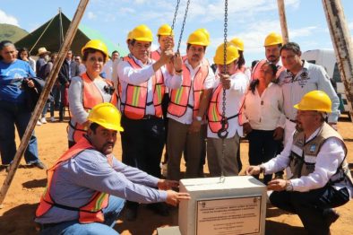 SANTA GERTRUDIS ZIMATLÁN, Oaxaca, julio 20.- El rector de la Universidad Autónoma “Benito Juárez” de Oaxaca (UABJO), Dr. Eduardo Bautista Martínez, colocó aquí la primera piedra de lo que en seis meses será el Hospital de Grandes Especies de la Facultad de Medicina Veterinaria y Zootecnia (FMVZ), con una inversión de 6 millones de pesos en su primera etapa.