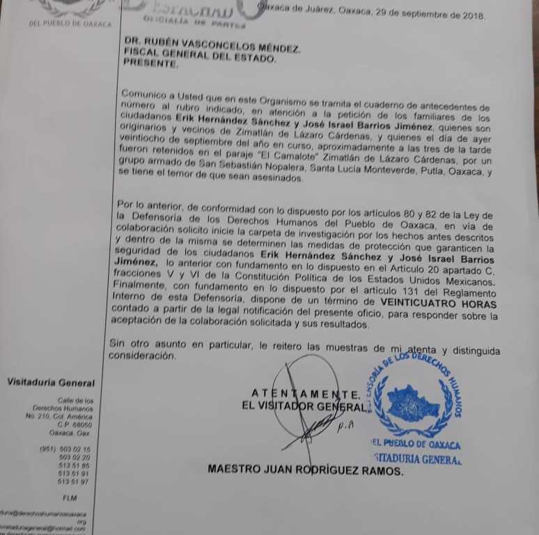 El día viernes veintiocho de septiembre de este año dos mil dieciocho, aproximadamente a las tres de la tarden en el paraje denominado el “camalote” perteneciente a la comunidad de Zimatlán de Lázaro Cárdenas, Putla de Guerrero Oaxaca, los señores Erick Hernández Sánchez de 37 años de edad, agente municipal electo para el año 2019 y José Israel Barrios Jiménez de 27 años de edad, agente suplente para el año 2019, quienes son originarios y vecinos de Zimatlán de Lázaro Cárdenas fueron retenidos por un grupo armado de San Sebastián Nopalera, Santa Lucia Monteverde, Putla Oaxaca; por lo que se tienen el temor de que sean asesinados. Las personas retenidas cuentan con Medidas Cautelares otorgadas por la Comisión Interamericana de Derechos Humanos CIDH.