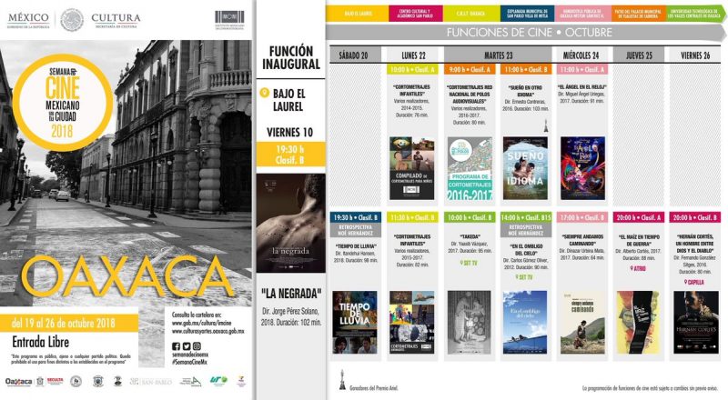 La semana de cine mexicano en tu ciudad 2018, será del 19 al 26 de octubre en diferentes horarios y sedes como: Bajo el Laurel, Centro Cultural y Académico San Pablo, Hemeroteca Pública Néstor Sánchez, CRIT Oaxaca, Explanada Municipal de San Pablo Villa de Mitla y de Tlalixtac de Cabrera e instalaciones de la Universidad Tecnológica de los Valles Centrales de Oaxaca.
