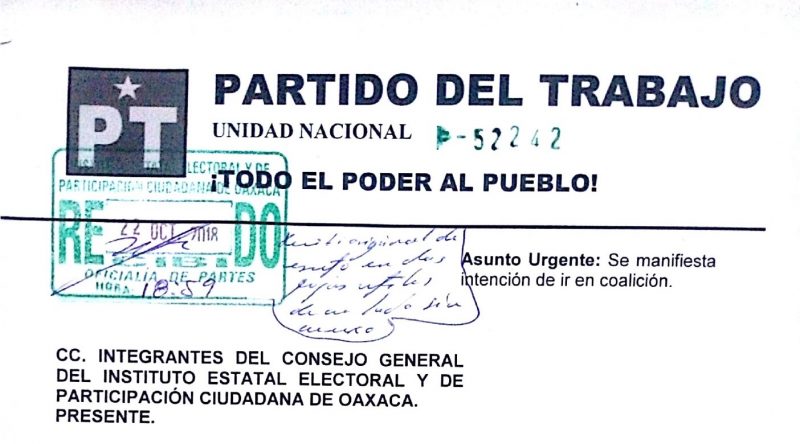 El Partido del Trabajo (PT) convoca a Morena y al PES a mantener la coalición Juntos haremos historia, para enfrentar unidos las elecciones municipales extraordinarias y por ello presentó en tiempo y forma ante el Instituto Estatal Electoral y de Participación de Oaxaca (IEEPCO), el documento donde formaliza su intención de participar en las que se llevarán a cabo, hasta el momento, en tres municipios de Oaxaca, informó el representante propietario del PT ante la autoridad electoral, Noel García Pacheco.