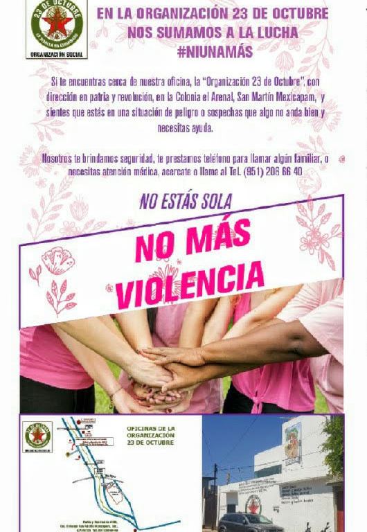 La secretaría de la mujer perteneciente a la organización 23 de octubre se suma a la campaña ni una más, con la intención de salvaguardar la integridad de las mujeres que se sientan en peligro, así lo dijo Betzabe Sosa Ruiz.