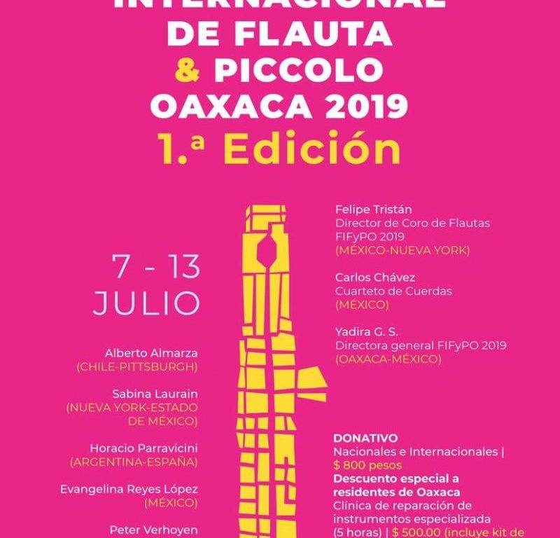 Oaxaca de Juárez, Oax. 26 de abril de 2019.- Por su fuerte tradición bandística, Oaxaca será sede del Primer Festival Internacional de Flauta y Piccolo Oaxaca (FIFyPO) 2019, a realizarse del 7 al 13 de julio en sedes como la Facultad de Bellas Artes de la Universidad Autónoma Benito Juárez de Oaxaca (UABJO) y en el municipio de Teotitlán del Valle; en el cual se impartirán clases magistrales, conferencias y conciertos, dirigido a un público a partir de los siete años.