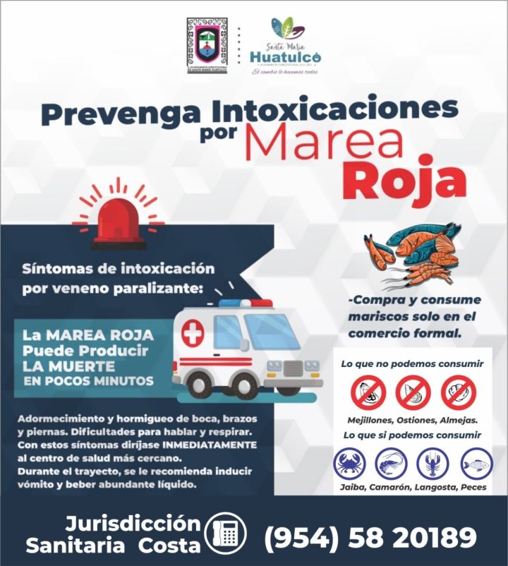 Esta alerta sanitaria abarca varios municipios de la región, desde Santa María Huatulco hasta Santiago Pinotepa Nacional, por lo que exhortamos a los visitantes y pobladores en general a evitar la compra y el consumo de moluscos bivalvos que provengan de esta zona, con el fin de salvaguardar su salud.