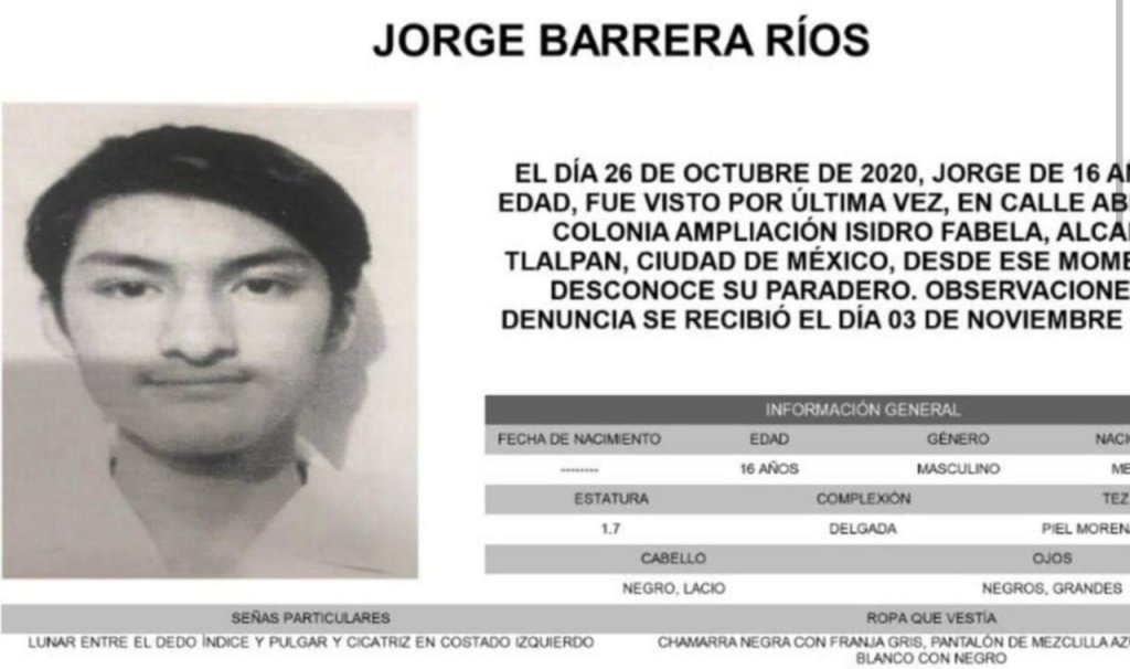 Jorge Barrera, estudiante de la preparatoria 5 de la Universidad Nacional Autónoma de México (UNAM) desapareció desde el pasado 26 de octubre luego de que sus compañeros le jugaron una broma.