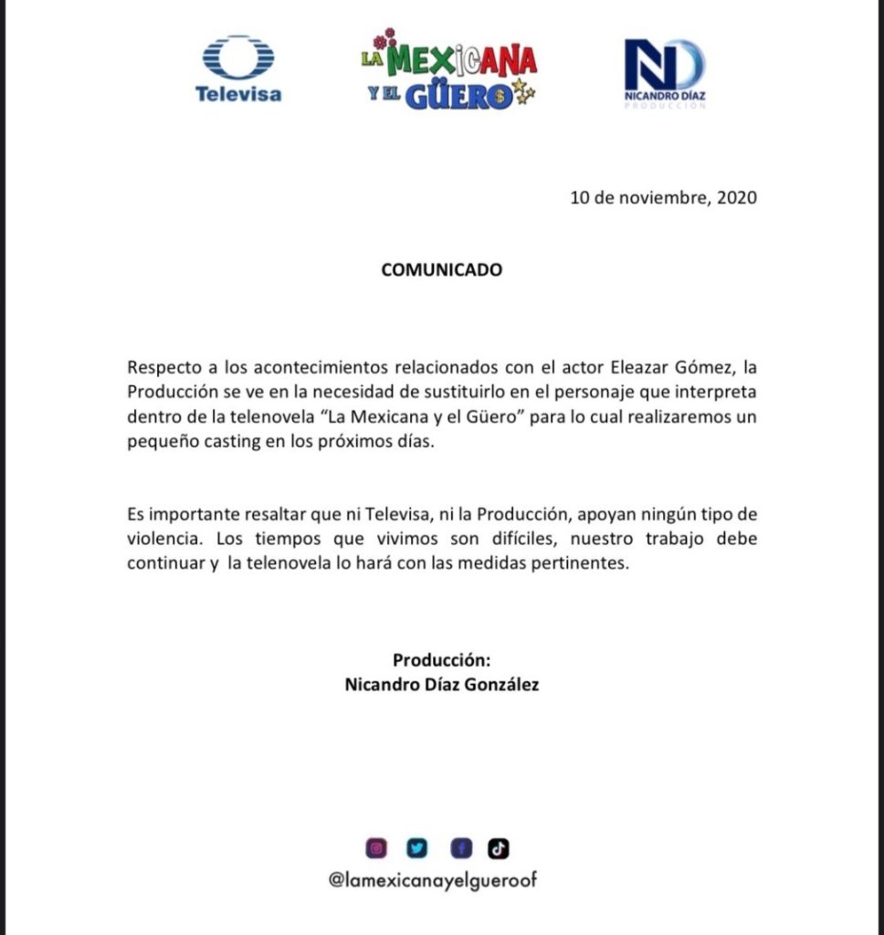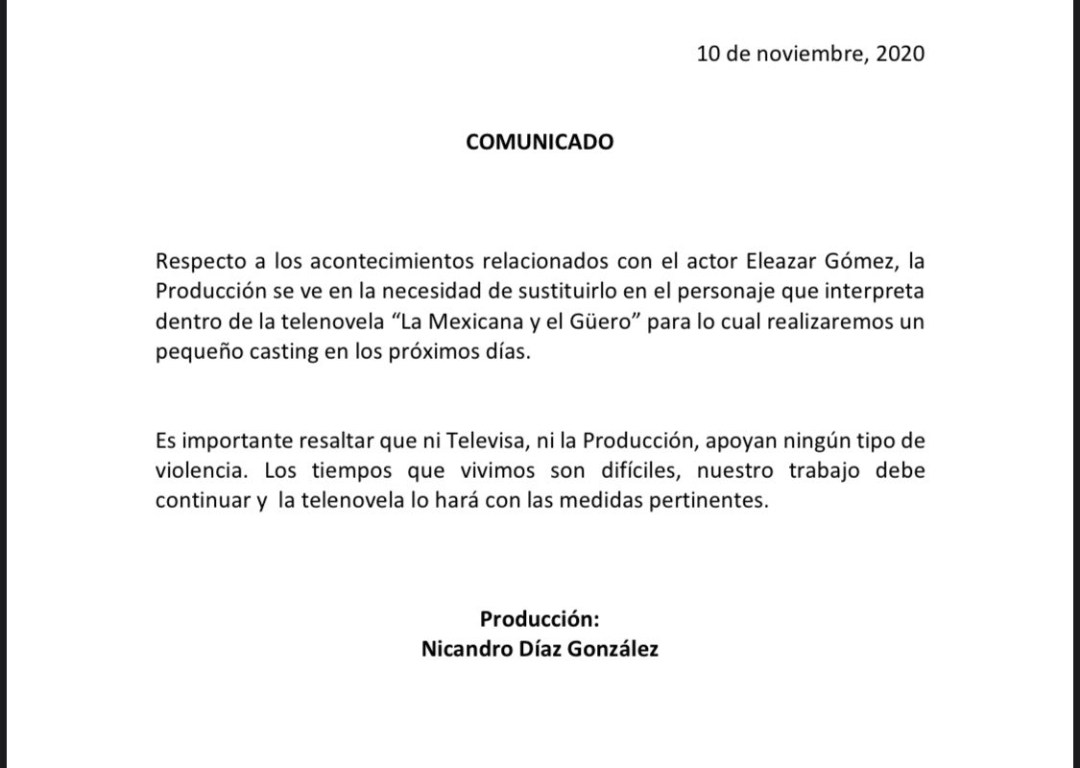En un comunicado dado a conocer este mates, el productor Nicandro Díaz detalló que será en próximos días cuando se realice un casting para el papel que desempeña Eleazar Gómez en la telenovela.