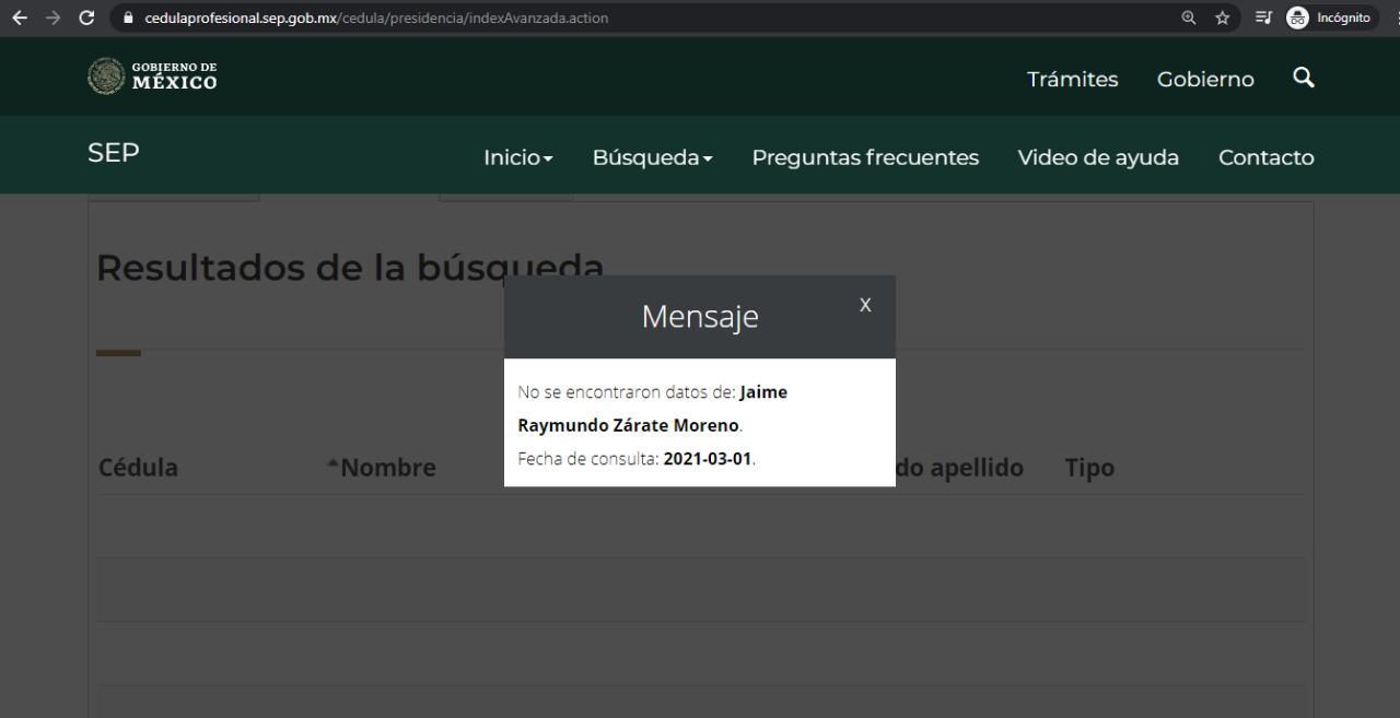 Lo anterior, nos llevó a realizar una búsqueda en la página web cedulaprofesional.sep.gob.mx, en donde efectivamente no fueron encontrados datos al buscar por su nombre, situación que provoca que incurra en diversos delitos ya que sus documentos firmados como licenciado no tienen validez, viola la ley de profesiones y se arriesga a ser inhabilitado de la función pública por mentir y hacerse pasar por algo que no es.