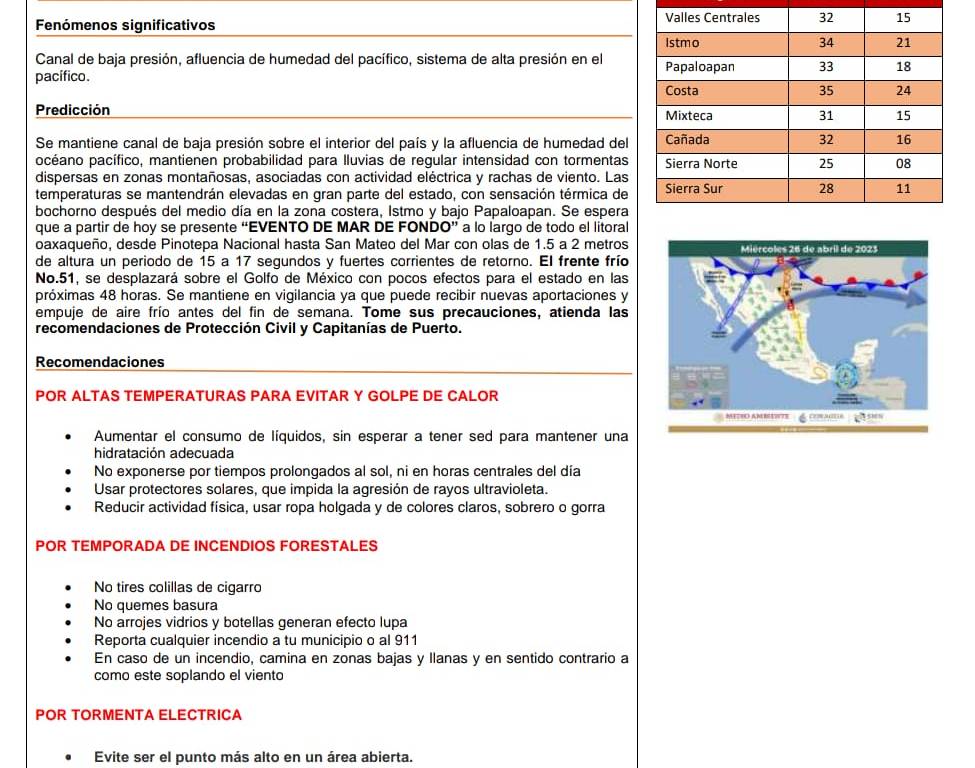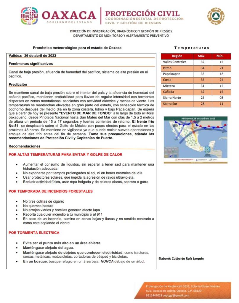 De conformidad con el pronóstico meteorológico para el estado de Oaxaca, el día de hoy 26 de abril de 2023, se mantiene la probabilidad para lluvias de regular intensidad con tormentas dispersas en zonas montañosas, asociadas con actividad eléctrica y rachas de viento.