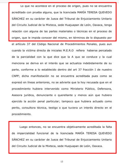 La sala constitucional y cuarta sala penal colegiada del Tribunal Superior de Justicia de Oaxaca (TSJO) determinaron que son infundados los argumentos de la saxofonista María Elena Ríos para recusar (apartar del caso) a la jueza María Teresa Quevedo Sánchez por actos de corrupción y parcialidad ya que no se da por probado que la jueza tenga relación con la parte material, es decir con la defensa y desechó la recusación contra la jueza «por notoriamente improcedente».