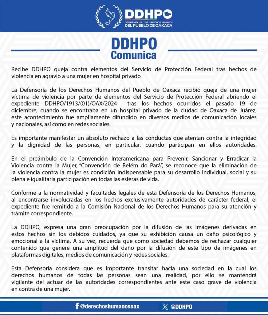 Tras la agresión que sufrió Andrea Monserrat por parte de elementos del Servicio de Proteccíón Federal, quienes fueron dirigidos por la saxofonista y diputada María Elena, así como su hermana Silvia, ambas de apellidos Ríos; la #DDHPO da a conocer sobre la queja que recibió y sobre el expediente que se inició.