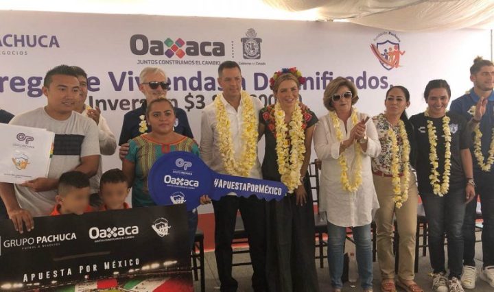 Matías Romero, Oax. 17 de julio de 2018. Luego de perderlo todo durante el sismo del 7 de septiembre del año pasado, Lisbeth Aquino, su mamá, esposo y sus dos hijos, volvieron a tener una casa digna. Ella y su familia fueron beneficiados con una de las ocho viviendas que la Fundación del Grupo Pachuca construyó y entregó este martes a los afectados del municipio de Matías Romero y Juchitán, y que requirió una inversión de 3.8 millones de pesos. Continúa leyendo Atestigua Alejandro Murat entrega de viviendas a afectados del Istmo