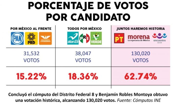 Alcanza Benjamín Robles 63% de votación, rebasa los 130 mil sufragios.-Al término del cómputo del Distrito Federal 08, la noche del jueves 5 de julio, el candidato a diputado federal de la coalición Juntos haremos historia, integrada por el PT, Morena y PES, Benjamín Robles Montoya obtuvo una votación histórica de 130,020 votos, lo que representa el 62.74% de los sufragios emitidos. Continúa leyendo Alcanza Benjamín Robles 63% de votación, rebasa los 130 mil sufragios